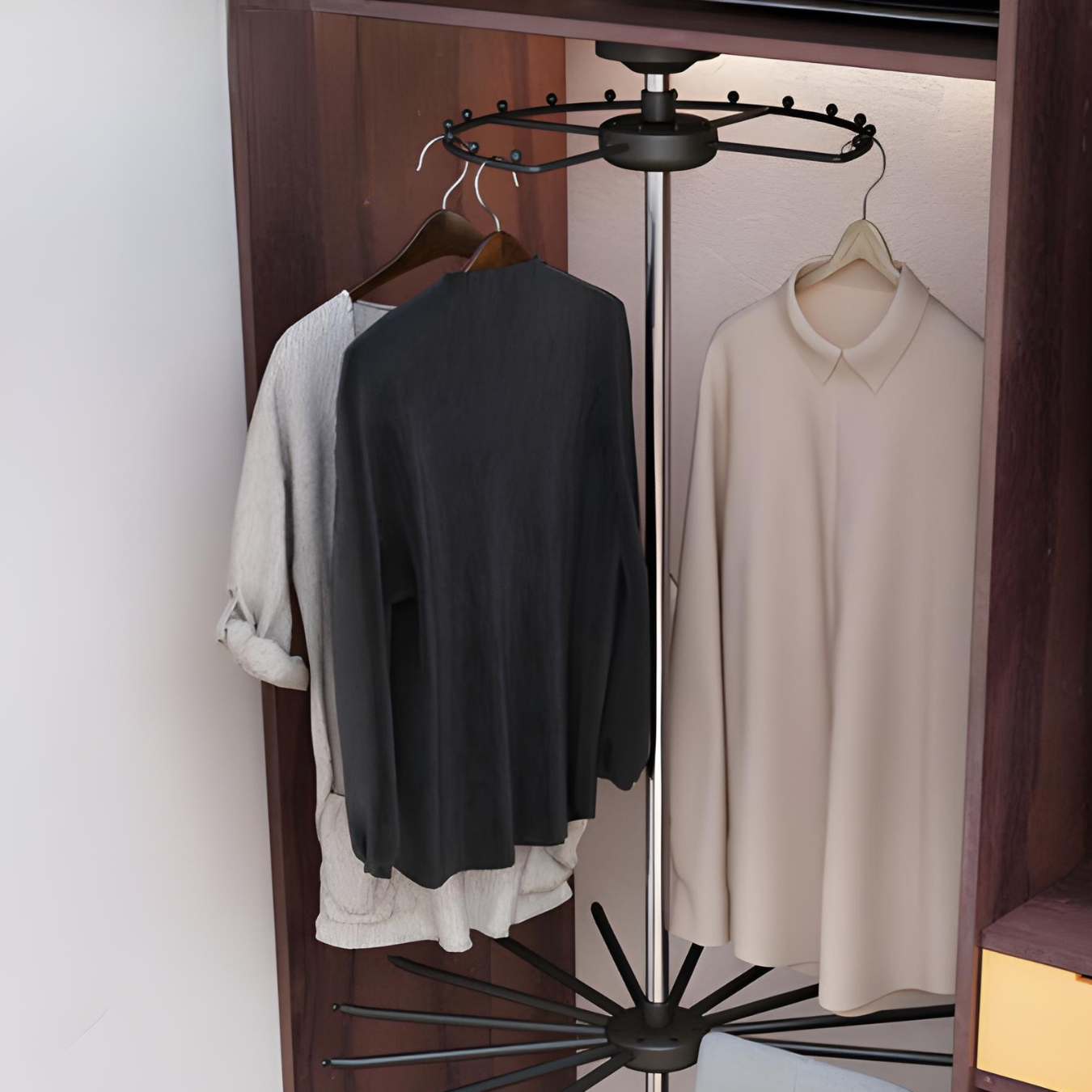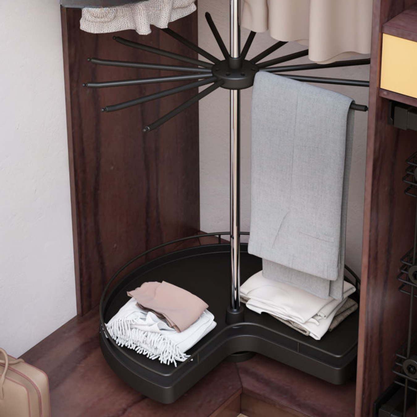 Looking to maximize your closet space? Our corner closet solution offers a 360° turning radius, allowing you to hang clothing from top to bottom on every layer.